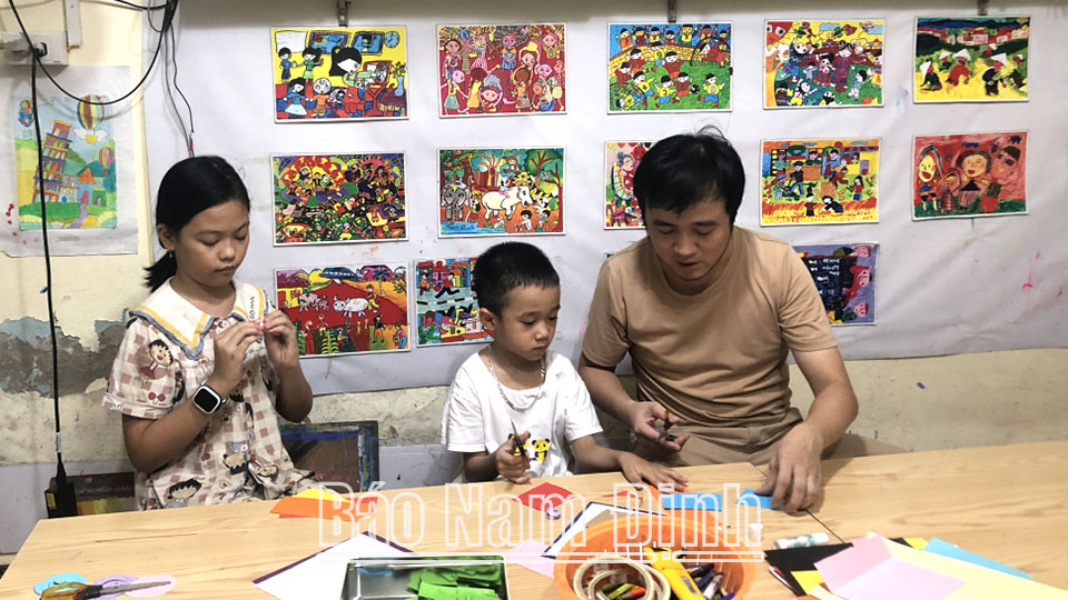 | Anh Trần Văn Hậu, chủ của xưởng mỹ thuật sáng tạo Hậu Trần art Nam Định (TP Nam Định) hướng dẫn học sinh cắt giấy tạo hình. |
