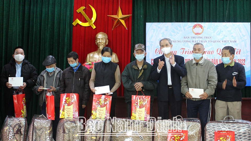 hiều 12-1, tại thành phố Nam Định, Ban Thường trực Ủy ban Trung ương MTTQ Việt Nam đã tổ chức chương trình trao quà Tết cho hộ nghèo của tỉnh. Tham dự chương trình có các đồng chí: Trương Thị Ngọc Ánh, Phó Chủ tịch Ủy ban Trung ương MTTQ Việt Nam; Đoàn Văn Hùng, Ủy viên Ban TVTU, Chủ tịch Ủy ban MTTQ tỉnh.