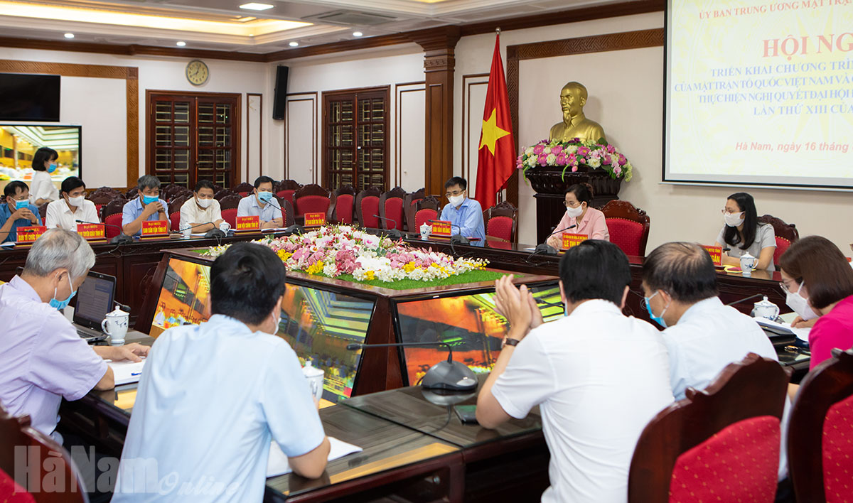Dự hội nghị ở điểm cầu Hà Nam có các đồng chí: Lê Thị Thủy, Ủy viên Trung ương Đảng, Bí thư Tỉnh ủy, Chủ tịch HĐND tỉnh; Nguyễn Anh Chức, Ủy viên BTV Tỉnh ủy, Phó Chủ tịch UBND tỉnh; Trần Thị Ngân , Ủy viên BTV Tỉnh ủy, Chủ tịch Ủy ban MTTQ tỉnh; Bùi Văn Hoàng, Tỉnh ủy viên, Phó Chủ tịch HĐND tỉnh; đại diện các ban xây dựng Đảng của Tỉnh ủy và các tổ chức thành viên MTTQ tỉnh.