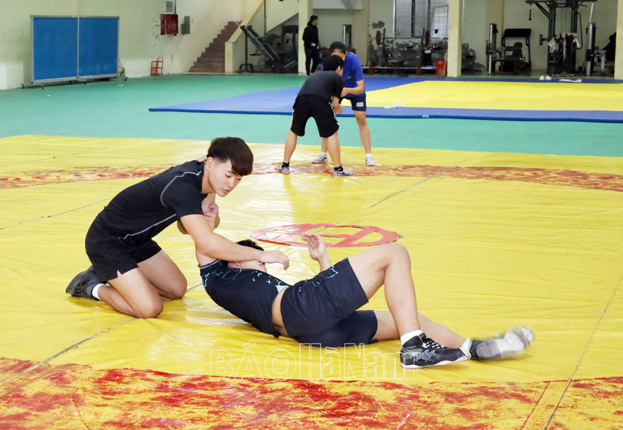 Nguyễn Minh Hoàng (trái) tập luyện với các đô vật Đội tuyển Vật Hà Nam.