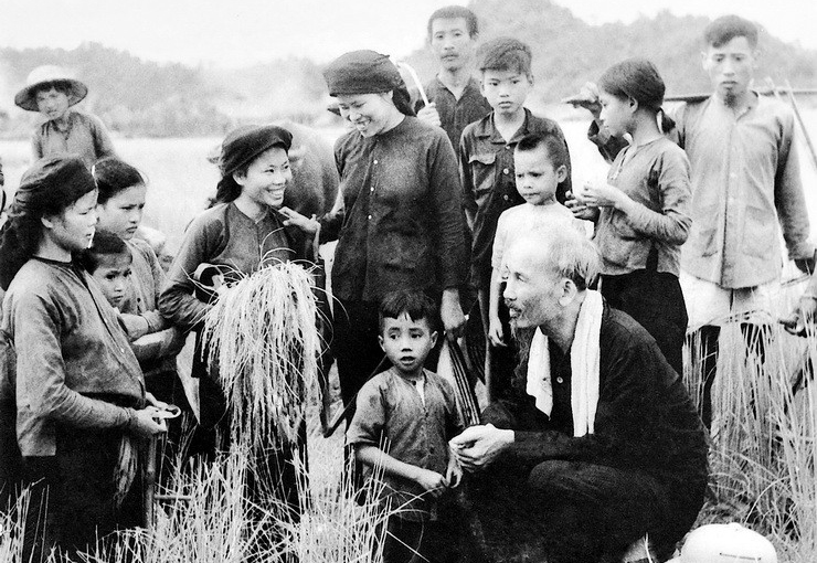 | Chủ tịch Hồ Chí Minh thăm hỏi nông dân Hợp tác xã Hùng Sơn (huyện Đại Từ, tỉnh Thái Nguyên) đang gặt lúa, năm 1954. Ảnh: Tư liệu |