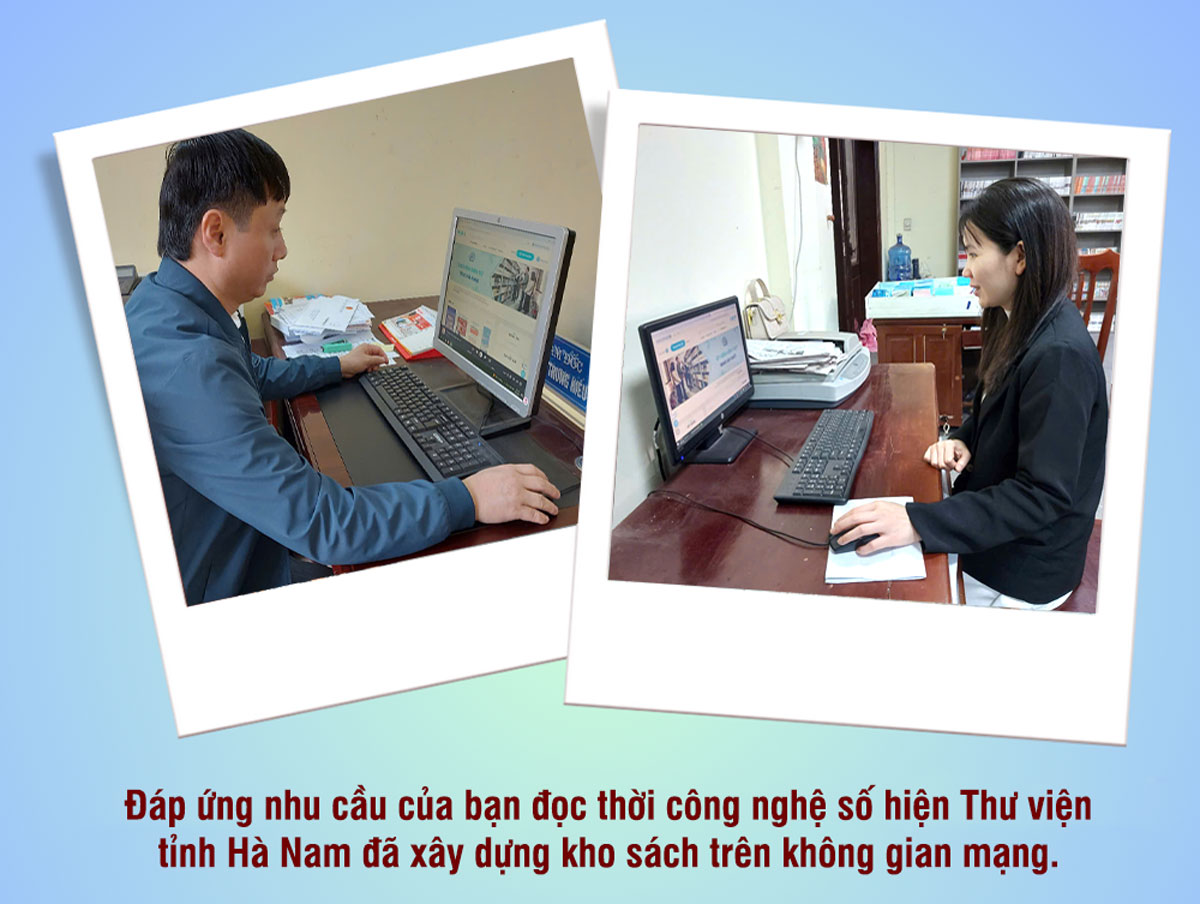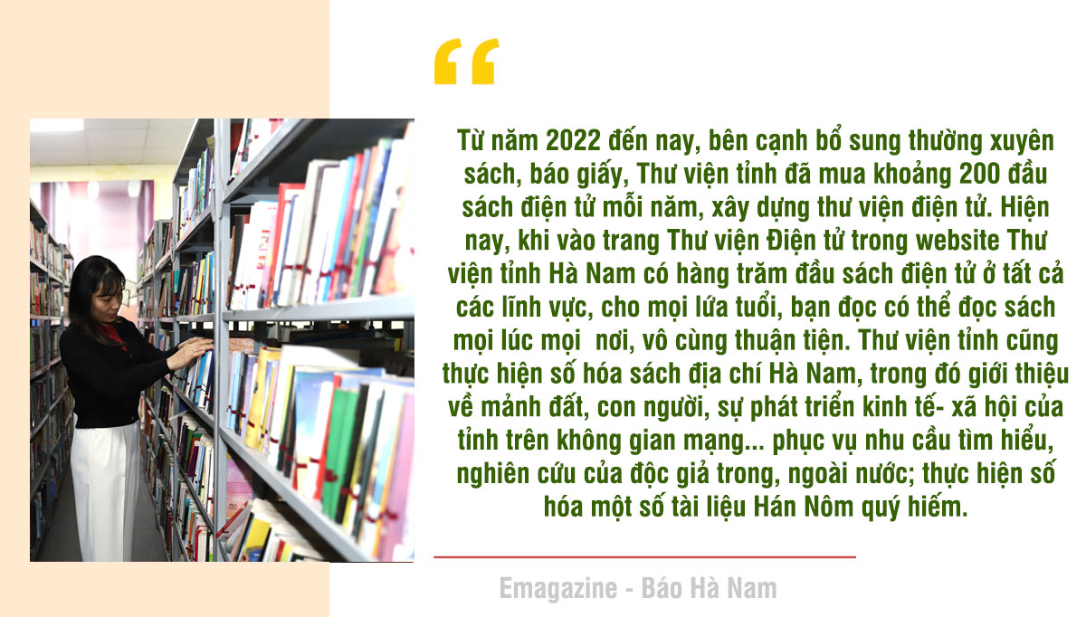 Thực hiện kế hoạch, hệ thống thư viện trong tỉnh được quan tâm đầu tư cơ sở vật chất; ứng dụng công nghệ thông tin vào các khâu nghiệp vụ thư viện, tiến đến hiện đại hóa thư viện. Đồng thời, từng bước phát triển thư viện điện tử, đáp ứng nhu cầu đọc và thông tin đa dạng của nhân dân trong tỉnh... Trao đổi với ông Đinh Trung Hiếu, Giám đốc Thư viện tỉnh được biết, dù còn nhiều khó khăn nhưng những năm qua Thư viện tỉnh đã tích cực thực hiện việc số hóa. Cách đây nhiều năm, đơn vị đã thực hiện xây dựng thư mục điện tử, có hệ thống tra cứu mượn, trả sách trên mạng. Từ năm 2022 đến nay, bên cạnh bổ sung thường xuyên sách, báo giấy, Thư viện tỉnh đã mua khoảng 200 đầu sách điện tử mỗi năm, xây dựng thư viện điện tử. Hiện nay, khi vào trang Thư viện Điện tử trong website Thư viện tỉnh Hà Nam có hàng trăm đầu sách điện tử ở tất cả các lĩnh vực, cho mọi lứa tuổi, bạn đọc có thể đọc sách mọi lúc mọi nơi, vô cùng thuận tiện. Thư viện tỉnh cũng thực hiện số hóa sách địa chí Hà Nam, trong đó giới thiệu về mảnh đất, con người, sự phát triển kinh tế- xã hội của tỉnh trên không gian mạng... phục vụ nhu cầu tìm hiểu, nghiên cứu của độc giả trong, ngoài nước; thực hiện số hóa một số tài liệu Hán Nôm quý hiếm. Tận dụng lợi thế của môi trường số, đội ngũ cán bộ Thư viện tỉnh cũng thường xuyên giới thiệu sách trên website; phối hợp với Báo Hà Nam thực hiện chương trình “Sách hay cuối tuần” để giới thiệu những cuốn sách hay vào mỗi cuối tuần trên sóng truyền hình.