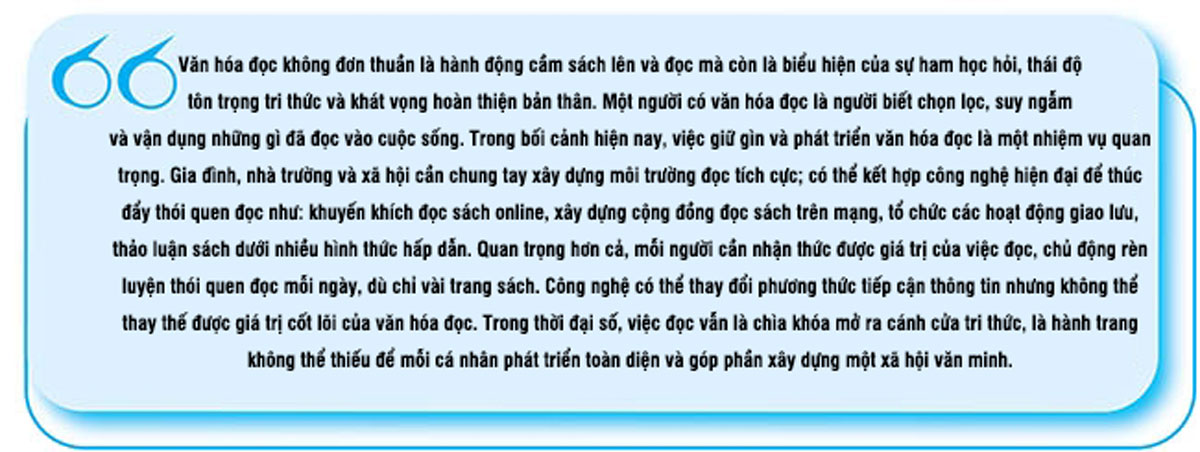 Văn hóa đọc không đơn thuần là hành động cầm sách lên và đọc mà còn là biểu hiện của sự ham học hỏi, thái độ tôn trọng tri thức và khát vọng hoàn thiện bản thân. Một người có văn hóa đọc là người biết chọn lọc, suy ngẫm và vận dụng những gì đã đọc vào cuộc sống. Trong bối cảnh hiện nay, việc giữ gìn và phát triển văn hóa đọc là một nhiệm vụ quan trọng. Gia đình, nhà trường và xã hội cần chung tay xây dựng môi trường đọc tích cực; có thể kết hợp công nghệ hiện đại để thúc đẩy thói quen đọc như: khuyến khích đọc sách online, xây dựng cộng đồng đọc sách trên mạng, tổ chức các hoạt động giao lưu, thảo luận sách dưới nhiều hình thức hấp dẫn. Quan trọng hơn cả, mỗi người cần nhận thức được giá trị của việc đọc, chủ động rèn luyện thói quen đọc mỗi ngày, dù chỉ vài trang sách. Công nghệ có thể thay đổi phương thức tiếp cận thông tin nhưng không thể thay thế được giá trị cốt lõi của văn hóa đọc. Trong thời đại số, việc đọc vẫn là chìa khóa mở ra cánh cửa tri thức, là hành trang không thể thiếu để mỗi cá nhân phát triển toàn diện và góp phần xây dựng một xã hội văn minh.