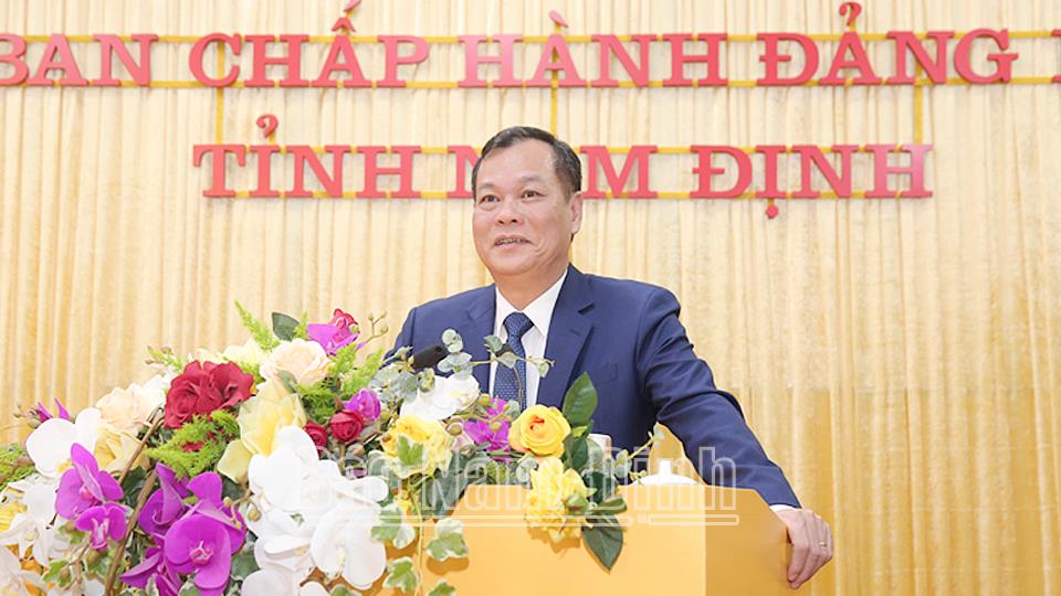 | Đồng chí Phó Bí thư Thường trực Tỉnh ủy Lê Quốc Chỉnh phát biểu giao nhiệm vụ cho các đồng chí Phó Chánh Văn phòng Tỉnh ủy Khúc Thành Trung và Nguyễn Thị Thanh Xuân. |