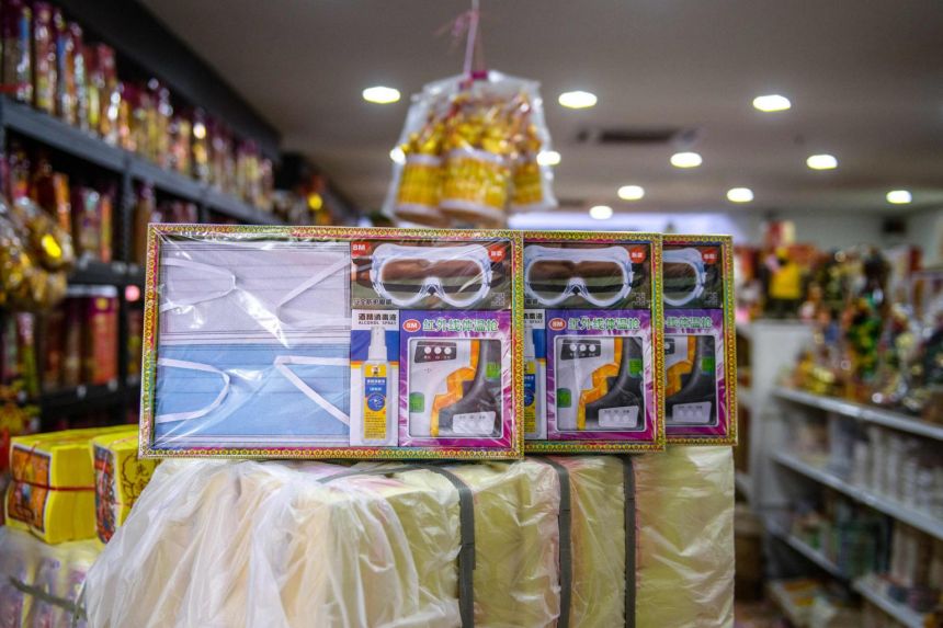 Khẩu trang, kính che mắt, nước sát khuẩn tay bằng giấy… chính là những món vàng mã mới mà người Trung Quốc ở Malaysia đốt cho người thân quá cố vào dịp Tiết Thanh minh.