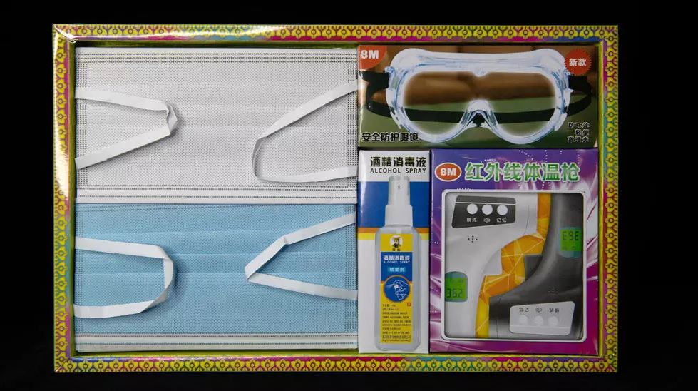 Đáng chú ý, nổi bật trong các loại vàng mã năm nay là bộ dụng cụ ngừa COVID-19, bao gồm khẩu trang, kính che mắt, nước sát khuẩn tay và nhiệt kế điện tử. Người Trung Quốc hy vọng người quá cố có thể sử dụng chúng để chống dịch viêm đường hô hấp cấp COVID-19 ở thế giới bên kia.