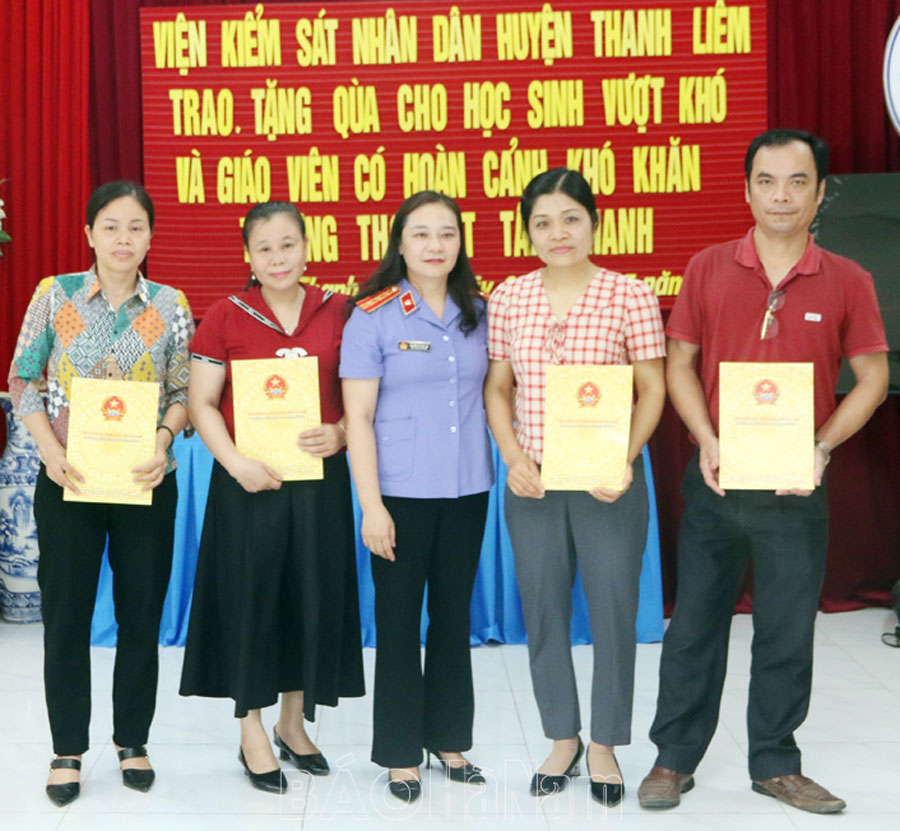 Nhằm động viên, khích lệ các em học sinh có hoàn cảnh khó khăn thêm nghị lực vươn lên trong học tập và động viên các thầy cô giáo có hoàn cảnh khó khăn trong công tác, chiều 25/5, Viện Kiểm sát nhân dân (KSND) huyện Thanh Liêm phối hợp với Ban giám hiệu Trường THCS Tân Thanh (thị trấn Tân Thanh, huyện Thanh Liêm) tổ chức chương trình trao tặng quà cho các cháu học sinh có hoàn cảnh khó khăn vượt khó, học giỏi và giáo viên có hoàn cảnh khó khăn đạt thành tích cao trong công tác giảng dạy.