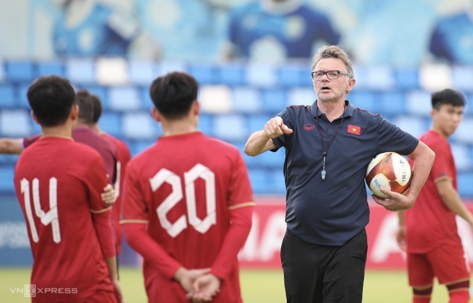 HLV Troussier chỉ đạo các cầu thủ Việt Nam tập luyện ở SEA Games 32, hồi tháng 5/2023 tại Campuchia. Ảnh: Lâm Thỏa