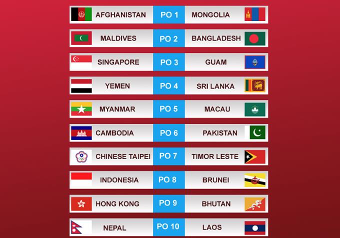 AFC tiến hành bốc thăm vòng 1 vào 13h giờ hôm nay và đã xác định 10 cặp đấu, gồm: Afghanistan - Mông Cổ, Maldives - Bangladesh, Singapore - Guam, Yemen - Sri Lanka, Myanmar - Macau, Campuchia - Pakistan, Đài Bắc Trung Hoa - Timor Leste, Indonesia - Brunei, Hong Kong - Bhutan và Nepal - Lào.