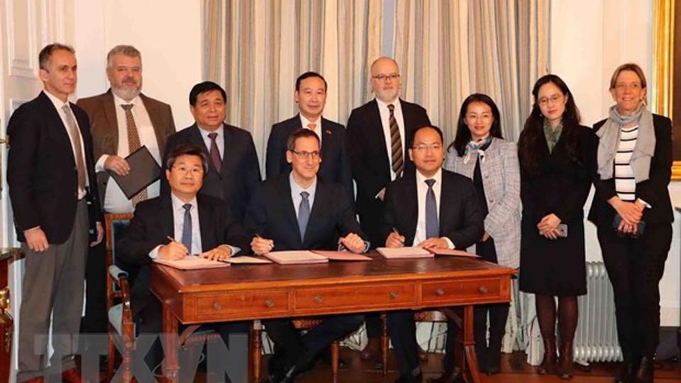| Ký kết bản ghi nhớ giữa Tập đoàn John Cockerill của Bỉ, Bộ Kế hoạch và Đầu tư, Trung tâm đổi mới sáng tạo quốc gia Việt Nam - NIC. (Ảnh: TTXVN) |