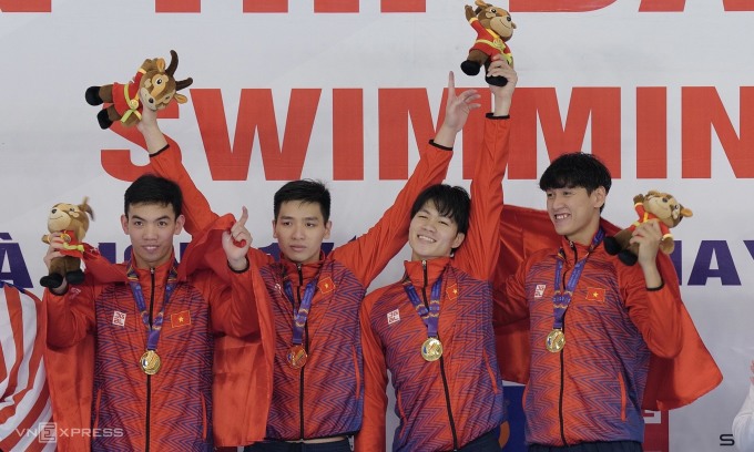 Với thành tích 7 phút 16 giây 310, Quý Phước, Huy Hoàng, Kim Sơn và Hưng Nguyên cũng đem về HC vàng quý giá cho bơi Việt Nam ở nội dung tự do tiếp sức 4x200m nam. Còn người "chốt sổ" cho chủ nhà hôm nay là Phan Văn Đông ở thể thao điện tử, nội dung PUBG Mobile.