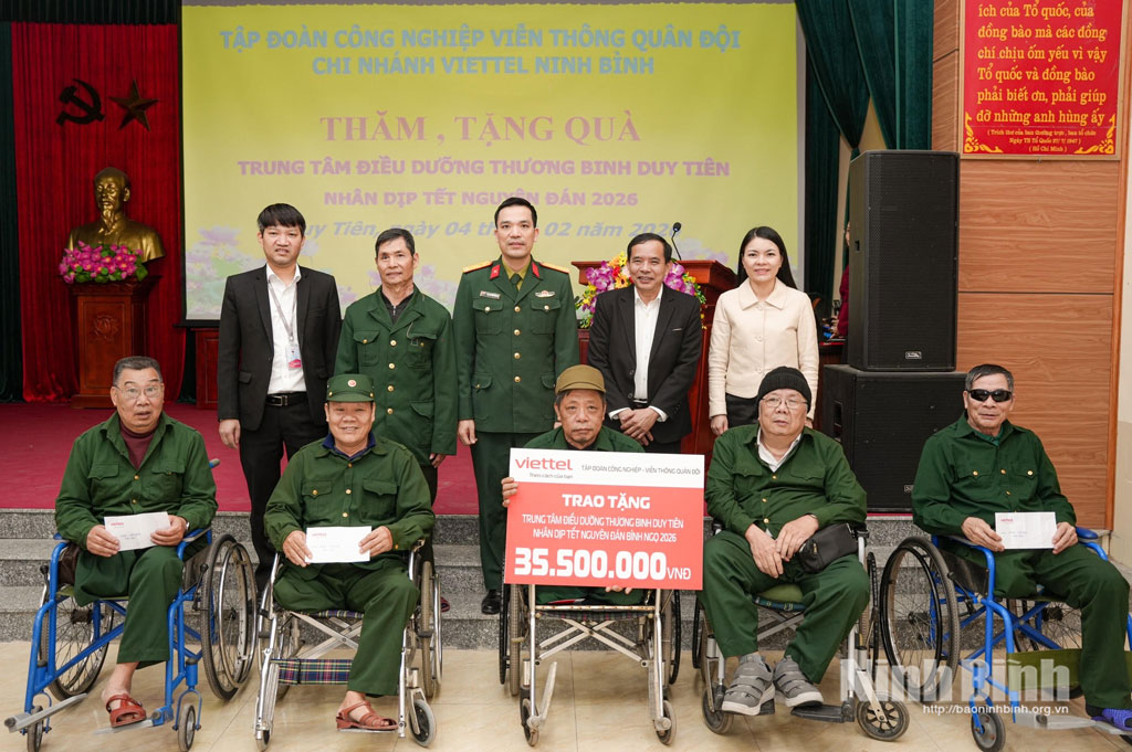 Nhân dịp Tết Nguyên đán Bính Ngọ 2026, ngày 4/2, Viettel Ninh Bình tổ chức thăm, tặng quà và tri ân các thương, bệnh binh đang được chăm sóc, điều trị tại Trung tâm Điều dưỡng thương binh Kim Bảng và Trung tâm Điều dưỡng thương binh Duy Tiên.