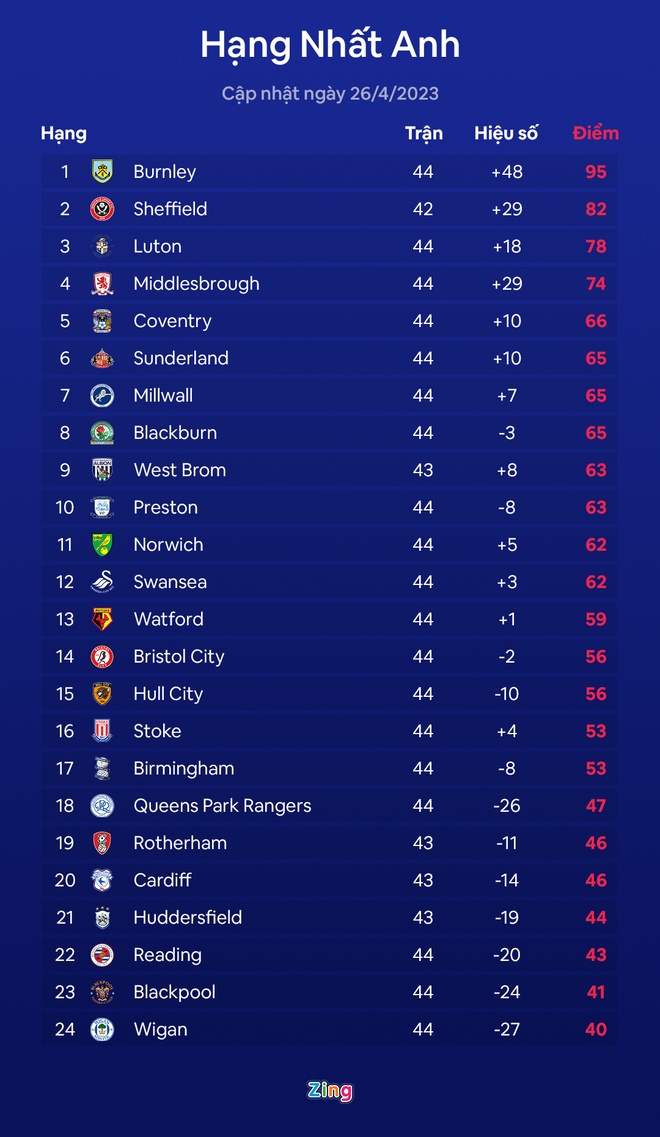 Sau Burnley, chủ nhân tiếp theo của tấm vé thăng hạng trực tiếp lên Premier League 2023/24 cũng dần lộ diện. Nếu Sheffield giành 3 điểm trước West Brom vào rạng sáng mai (27/4), họ cũng sẽ theo chân nhà vô địch lên chơi ở giải đấu cao nhất xứ sương mù.