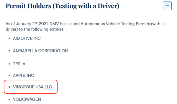 Cùng lúc, trên website của Cơ quan quản lý phương tiện California (www.dmv.ca.gov) đưa tên Vingroup USA vào danh sách những đơn vị được phép thử nghiệm xe trên địa bàn bang California.