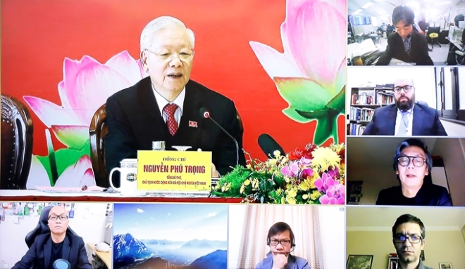 | Tổng Bí thư, Chủ tịch nước Nguyễn Phú Trọng trả lời các câu hỏi của phóng viên cơ quan thông tấn, báo chí trong nước và quốc tế, được tiến hành trực tiếp và trực tuyến tại buổi họp báo thông báo kết quả Đại hội XIII của Đảng |