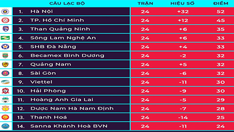 | Bảng xếp hạng V.League mới nhất sau 24 vòng đấu |