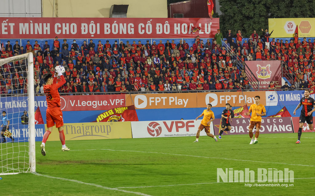 Nhiều pha dứt điểm của các cầu thủ đội chủ nhà Ninh Bình FC không thể vượt qua bàn tay của thủ môn đội khách.