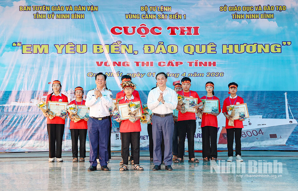 Chiều 1/4, tại Trường THCS Nghĩa Tân (xã Quỹ Nhất), Bộ Tư lệnh Vùng Cảnh sát biển 1 phối hợp với Ban Tuyên giáo và Dân vận Tỉnh ủy, Sở Giáo dục và Đào tạo tỉnh Ninh Bình tổ chức Vòng chung kết cấp tỉnh Cuộc thi “Em yêu biển, đảo quê hương” năm 2026. Tới dự có các đồng chí: Thiếu tướng Trần Văn Thơ, Tư lệnh Vùng Cảnh sát biển 1; Thiếu tướng Trần Văn Hậu, Bí thư Đảng ủy, Chính ủy Bộ Tư lệnh Vùng Cảnh sát biển 1; Đặng Anh Tuấn, Tỉnh ủy viên, Phó Trưởng Ban Tuyên giáo và Dân vận Tỉnh ủy; lãnh đạo Sở Giáo dục và Đào tạo; xã Quỹ Nhất…