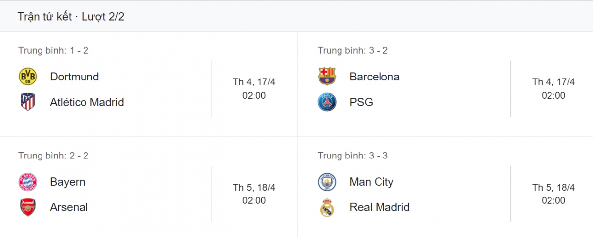 Trong khi đó, Bayern và Barca cũng được đá trên sân nhà trước Arsenal và PSG. Với sự tiếp sức của cổ động viên đội nhà, đây là cơ hội lớn để đại diện nước Đức và Tây Ban Nha giành tấm vé vào vòng bán kết.