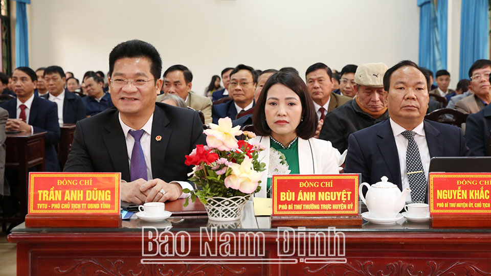 | Các đồng chí: Phó Bí thư Thường trực Tỉnh uỷ Lê Quốc Chỉnh; Phó Chủ tịch Thường trực UBND tỉnh Trần Anh Dũng tặng hoa chúc mừng huyện Vụ Bản. |