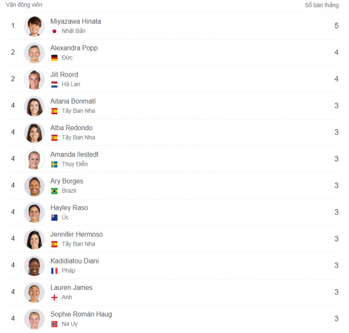 Hinata Miyazawa của ĐT nữ Nhật Bản vẫn là người vượt trội với 5 pha lập công. Cầu thủ sinh năm 1999 cũng ghi 1 bàn trong chiến thắng 3-1 trước Na Uy để đưa các cô gái Nhật Bản vào tứ kết.