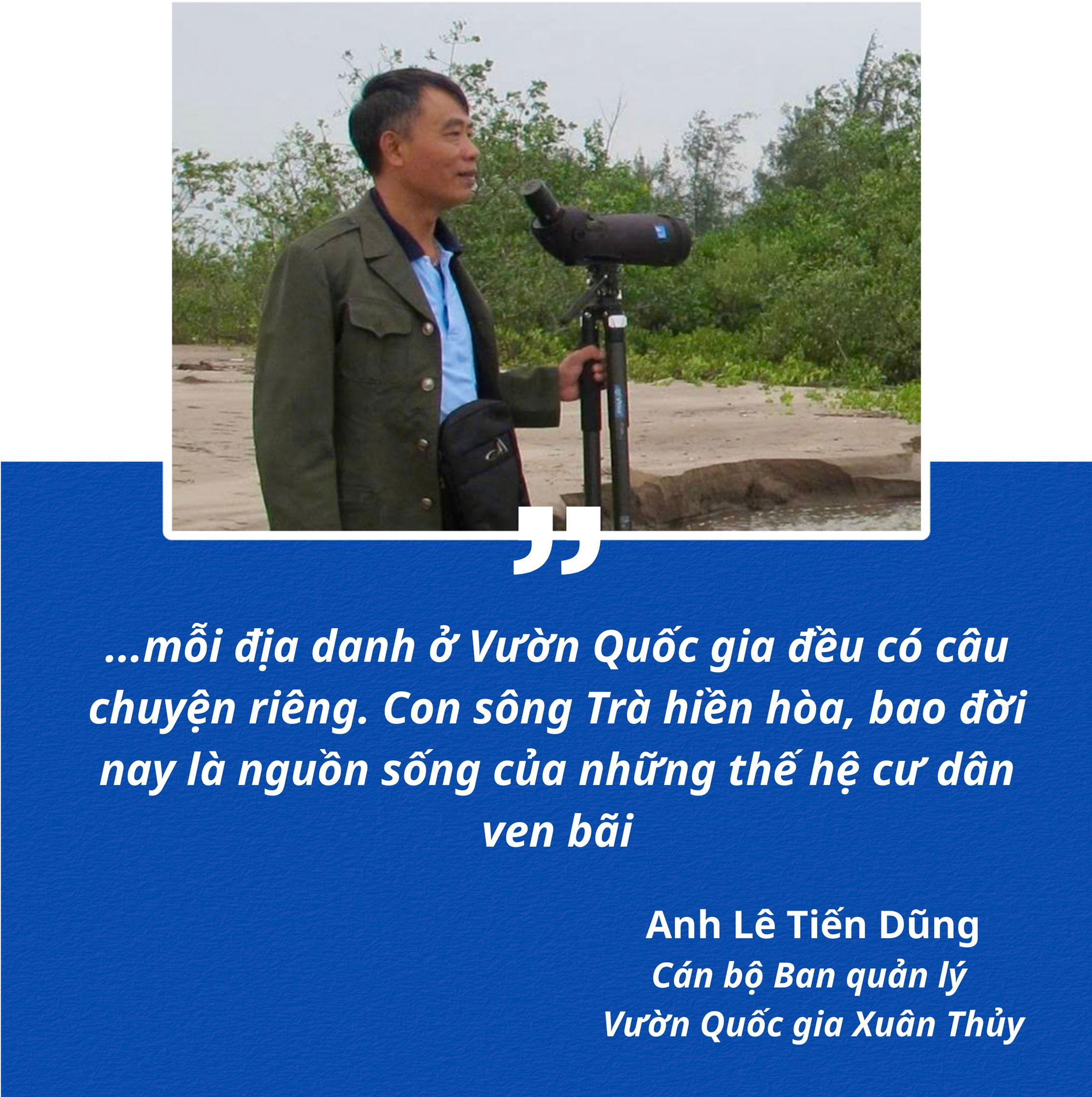 Vừa dẫn chúng tôi xuôi theo dòng sông Trà ra cửa Ba Lạt, để trải nghiệm và khám phá những điều kỳ thú ở Vườn Quốc gia Xuân Thủy, anh Lê Tiến Dũng, cán bộ Ban quản lý Vườn Quốc gia Xuân Thủy, người đã gắn bó với Vườn Quốc gia Xuân Thủy gần 30 năm, vừa kể: Vườn rộng hơn 7.000 ha, nằm trên địa bàn các xã Giao Minh, Giao Hòa và Giao Phúc; là vùng đất ngập nước cửa sông ven biển tiêu biểu với địa hình tự nhiên được kiến tạo theo quy luật bồi tụ và xói lở của vùng cửa sông châu thổ Bắc Bộ. Năm 1989, vùng đất ngập nước thuộc Vườn Quốc gia Xuân Thủy được công nhận là khu Ramsar đầu tiên của Việt Nam và Đông Nam Á; đánh dấu Việt Nam trở thành thành viên thứ 50 của Công ước Ramsar (Công ước bảo vệ những vùng đất ngập nước có tầm quan trọng quốc tế, nhất là nơi cư trú của các loài chim nước). Gần 30 năm gắn bó, anh yêu vùng đất này như máu thịt. Anh thuộc từng con nước, từng luồng lạch, từng bãi triều và đặc tính của từng loại chim. Anh bảo: mỗi địa danh ở Vườn Quốc gia đều có câu chuyện riêng. Con sông Trà hiền hòa, bao đời nay là nguồn sống của những thế hệ cư dân ven bãi.