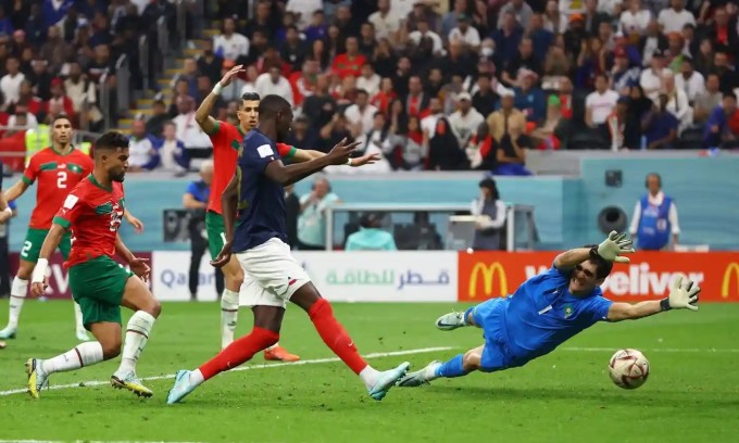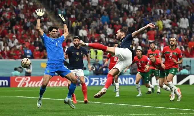 Pháp và Morocco bước vào trận bán kết thứ hai tại World Cup 2022 với sự tự tin cao. Bất ngờ xảy ra ngay ở phút thứ 5 khi đường chuyền vượt tuyến của Varane được Griezmann xử lý khôn khéo mở ra cơ hội tấn công cho Pháp. Sau hai lần dứt điểm bất thành của Mbappe, Hernandez băng vào dứt điểm bồi ở gần phía cột dọc trái ghi bàn thắng mở tỉ số.