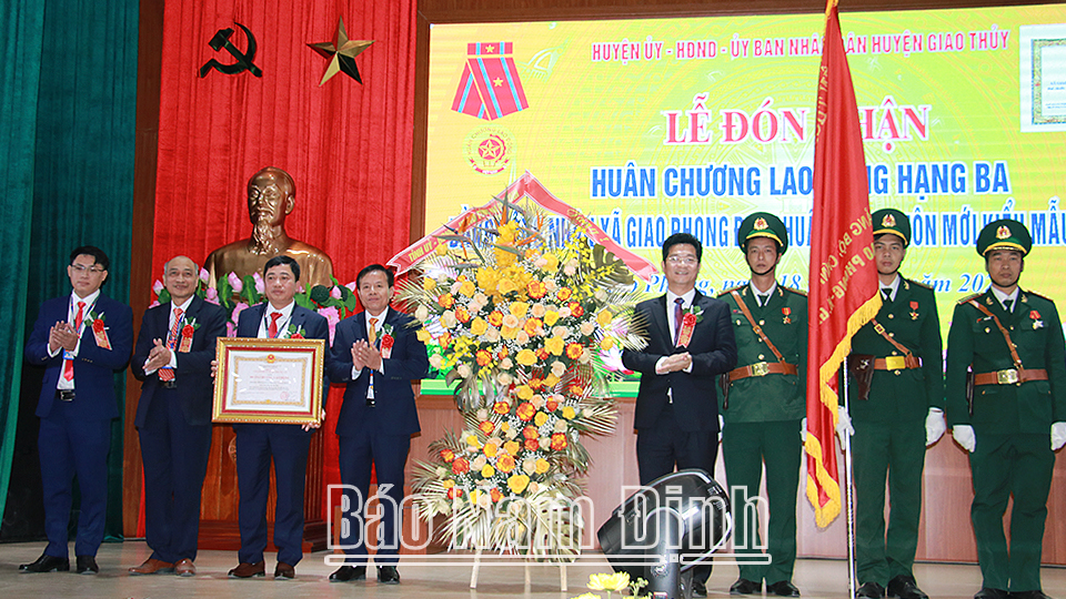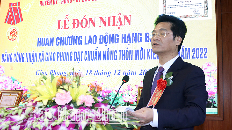 Tại buổi lễ, thừa uỷ quyền của Chủ tịch nước, đồng chí Phó Chủ tịch Thường trực UBND tỉnh đã trao tặng Đảng bộ, chính quyền và nhân dân xã Giao Phong Huân chương Lao động hạng Ba và Bằng công nhận xã đạt chuẩn NTM kiểu mẫu năm 2022.