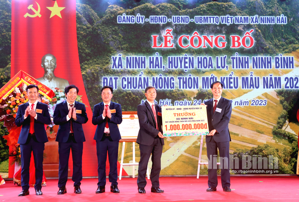 Tại buổi lễ, đồng chí Nguyễn Cao Sơn, TUV, Phó Chủ tịch UBND tỉnh đã trao Bằng công nhận xã đạt chuẩn NTM kiểu mẫu, lãnh đạo huyện Hoa Lư đã trao phần thưởng trị giá 1 tỷ đồng cho Đảng bộ, chính quyền và nhân dân xã Ninh Hải.