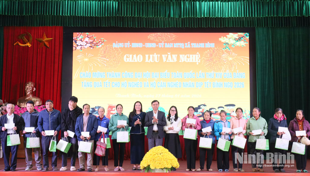 Sáng ngày 27/1, Đảng ủy, HĐND, UBND, Ủy ban MTTQ xã Thanh Bình tổ chức giao lưu văn nghệ chào mừng thành công Đại hội đại biểu toàn quốc lần thứ XIV của Đảng; chào mừng kỷ niệm 96 năm ngày thành lập Đảng cộng sản Việt Nam; tặng quà Tết cho hộ nghèo và hộ cận nghèo nhân dịp Tết Bính Ngọ năm 2026.