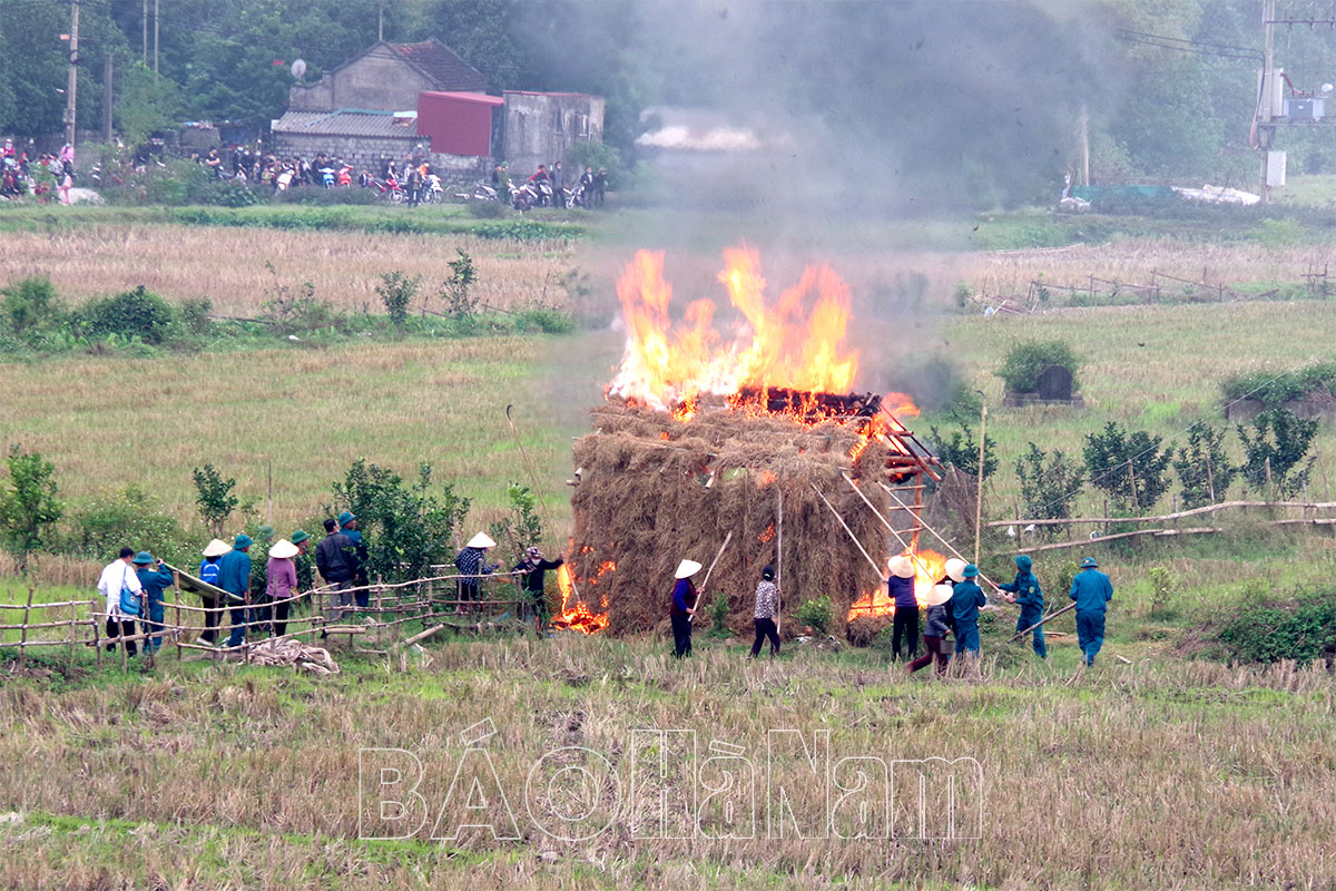 LLDQ và nhân dân xã Tràng An, huyện Bình Lục diễn tập dập tắt đám cháy trong thực hành đánh địch đổ bộ đường không.