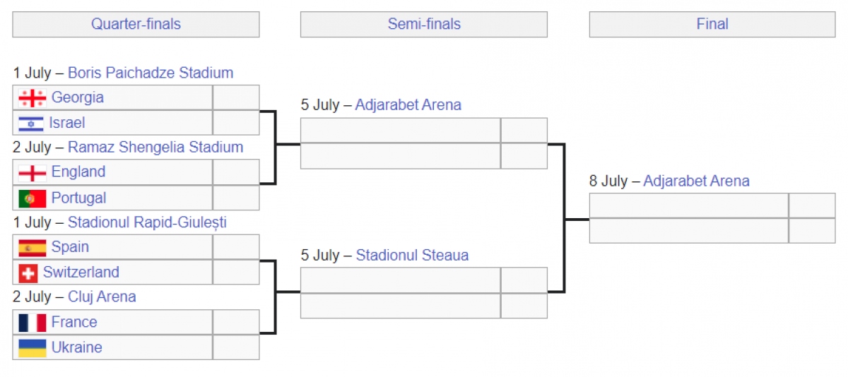 Khép lại vòng đấu bảng, Ban tổ chức xác định được các đội bóng giành vé vào tứ kết gồm U21 Georgia, U21 Bồ Đào Nha (bảng A); U21 Tây Ban Nha, U21 Ukraine (bảng B); U21 Anh, U21 Israel (bảng C) và U21 Pháp với U21 Thụy Sĩ (bảng D).
