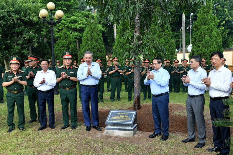 | Tổng Bí thư, Chủ tịch nước Tô Lâm; Thủ tướng Chính phủ Phạm Minh Chính và các đồng chí lãnh đạo Đảng, Nhà nước, Quân ủy Trung ương trồng cây lưu niệm trong khuôn viên Trụ sở Bộ Quốc phòng. |