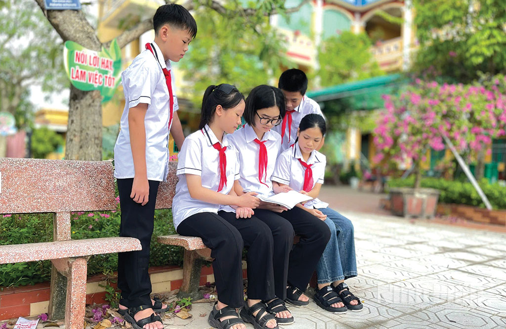 Học sinh Trường THCS Hải Xuân (xã Hải Xuân) trao đổi về bài học trước giờ lên lớp.