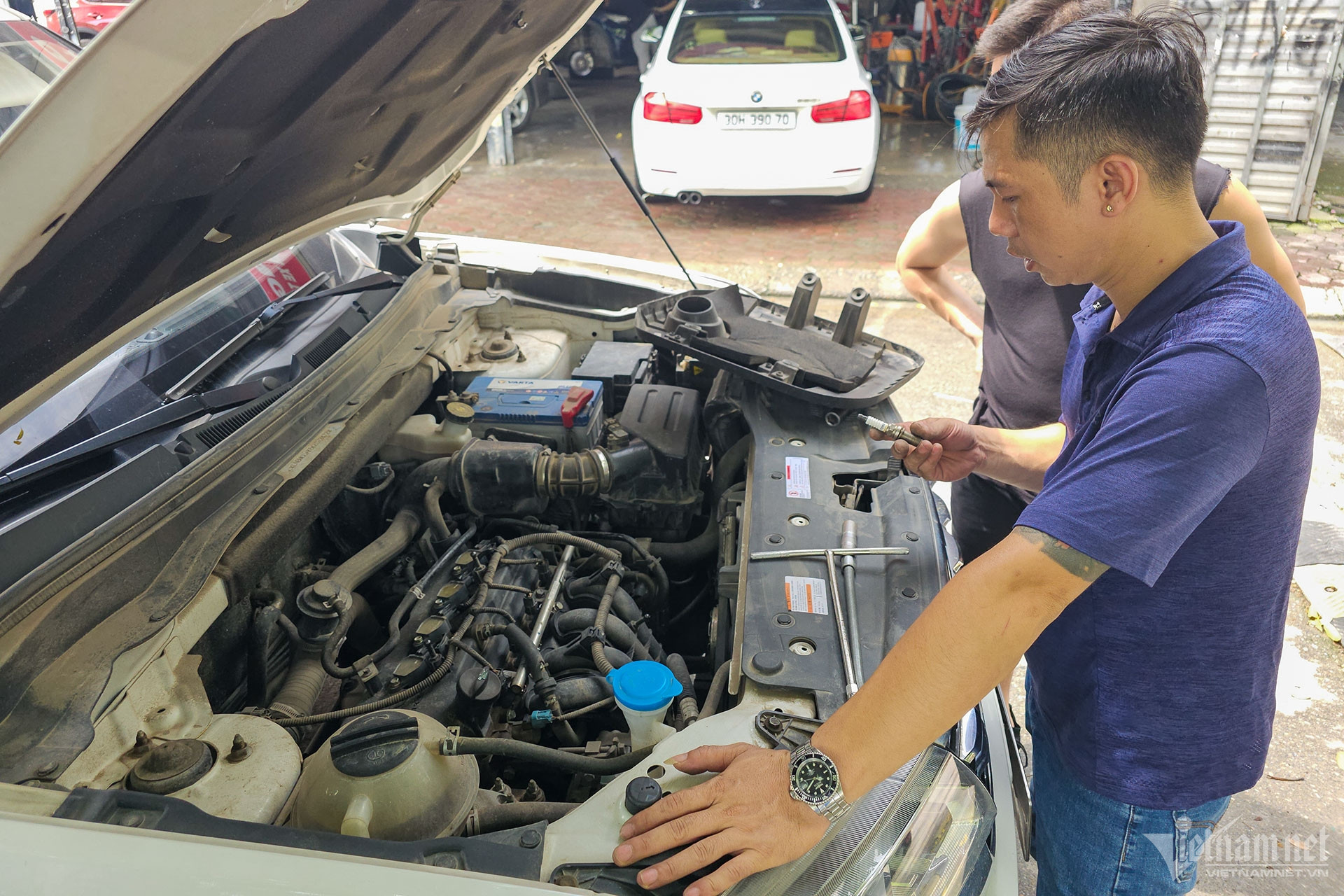 Anh Đoàn Quang Trung, chủ gara ô tô Trung Anh đang kiểm tra chiếc xe Mazda6 cho khách hàng. Ảnh: Ngô Minh