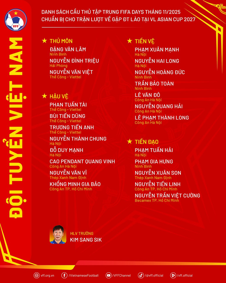 Ngày 6/11, huấn luyện viên trưởng Kim Sang Sik công bố danh sách 23 cầu thủ đội tuyển Việt Nam tập trung chuẩn bị cho trận đấu với đội tuyển Lào trong khuôn khổ lượt về vòng loại cuối Asian Cup 2027. Toàn đội sẽ hội quân ngày 10/11 tại Việt Trì (Phú Thọ) và dự kiến lên đường sang Lào vào ngày 15/11.