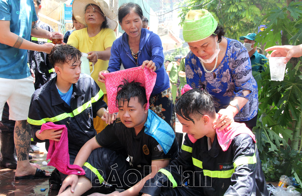 Nhiều người dân cùng tham gia chăm sóc sức khỏe cho các cán bộ, chiến sỹ sau nhiều giờ họ chiến đấu và chiến thắng với "giặc lửa" trong vụ hỏa hoạn này