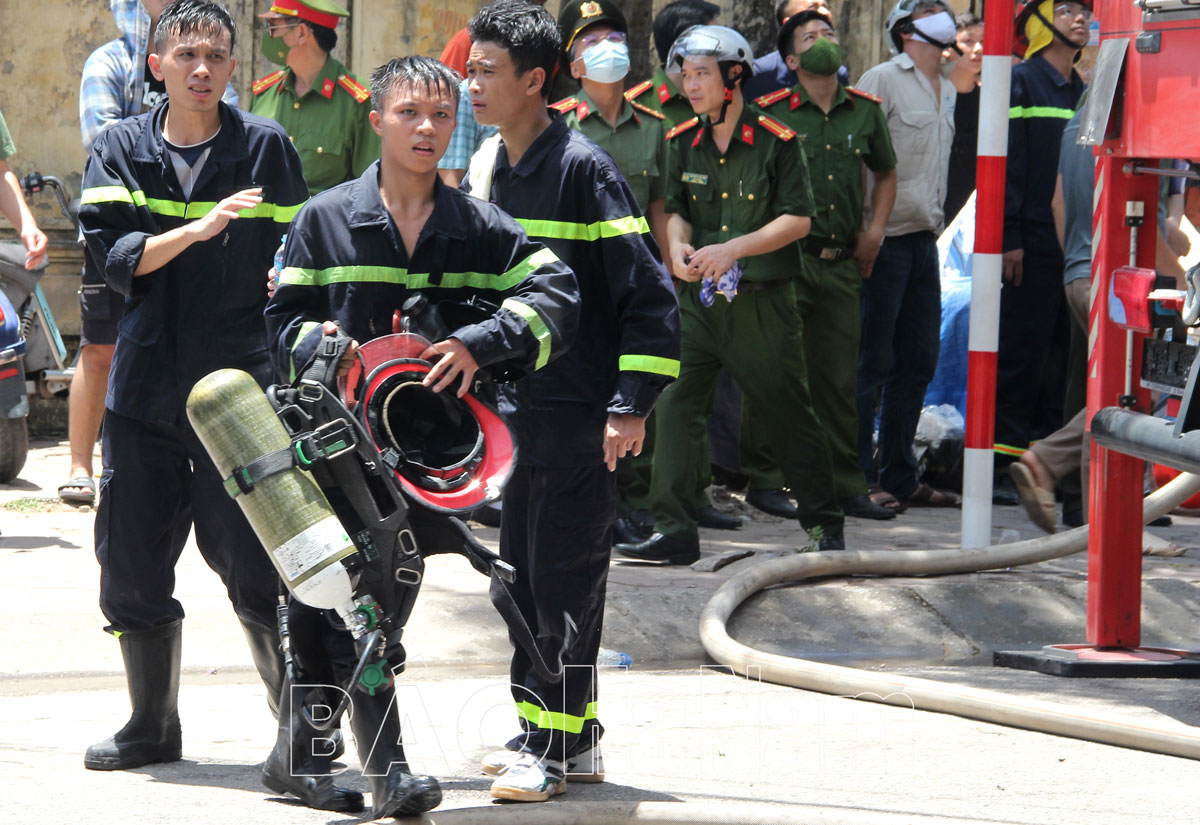 Nhiều cán bộ, chiến sỹ tỏ ra thấm mệt sau nhiều giờ dập lửa, cứu người dưới tiết trời oi nóng