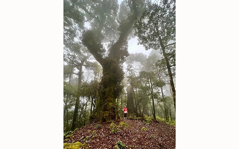 Trải dài dần theo độ cao 2.600m lên tới đỉnh, bước chân của chúng tôi tiến dần vào khu rừng nguyên sinh. Càng đi sâu, đường đi càng khó, bầu trời càng thu hẹp lại, khoảng xanh vời vợi dần thay thế bằng những tán cây già rộng lớn tầng thấp, tầng cao đan nhau che phủ. Quang cảnh vừa hùng vĩ vừa nên thơ với thảm rêu mềm mại miên man theo lối đi, phủ vàng từ dưới đất lên các thân cây cổ thụ, đại thụ ba bốn người ôm, rễ chằng chịt, hình dáng độc đáo, kỳ quái. Những cây chè cổ thụ vài trăm năm tuổi, thân cây xù xì, địa y phủ kín đang bật ra những búp chè xanh non. Những tảng đá cũng biến hình thành những cây rêu dày đặc với hình dáng phong phú. Thảm thực vật xanh mướt với nhiều loại dị thảo, hoa dại, dương xỉ. Độ hoang sơ, kỳ bí trong khu rừng tăng dần theo độ cao của hành trình leo núi. Vạt rừng xanh thẫm, lúc lại ngả vàng bởi những vạt phong non, hoa tớ dày điểm xuyết, hoa sơn tra trắng muốt.