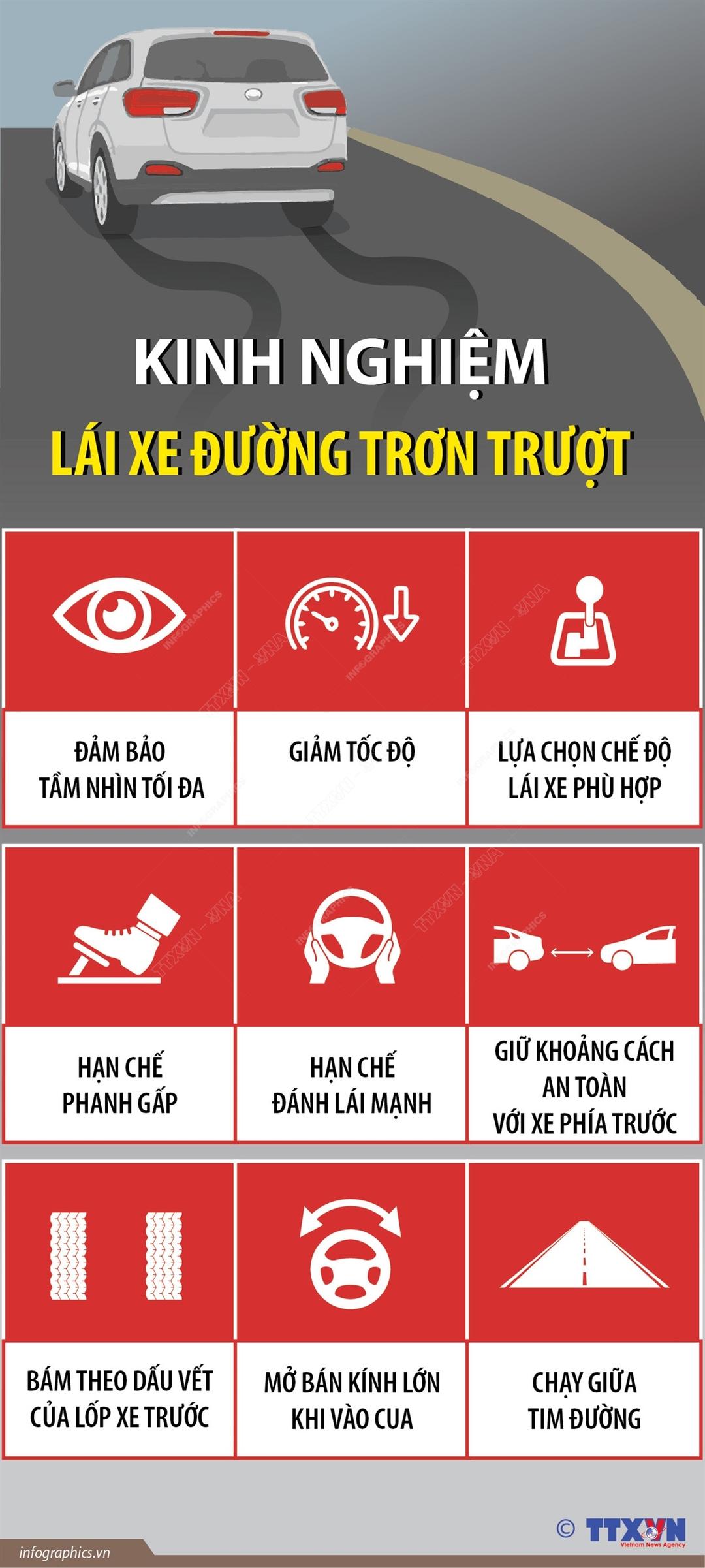 (Theo TTXVN)- Khi lái xe trên đường trơn, lốp dễ bị trượt, khiến xe mất kiểm soát, nguy hiểm hơn là dẫn đến tai nạn va chạm mạnh khi tham gia giao thông. Một số kinh nghiệm lái xe đường trơn sau đây sẽ giúp tránh tình trạng này.