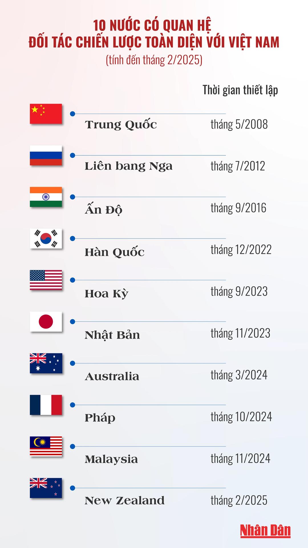 Tính đến tháng 2/2025, Việt Nam đã thiết lập quan hệ Đối tác chiến lược toàn diện với 10 quốc gia. Mới đây, ngày 26/2, trong khuôn khổ chuyến thăm chính thức Việt Nam và dự Diễn đàn Tương lai ASEAN lần thứ 2 của Thủ tướng New Zealand Christopher Luxon (25-28/2), hai nước đã ký Tuyên bố chung về việc nâng cấp quan hệ Việt Nam-New Zealand lên Đối tác chiến lược toàn diện.