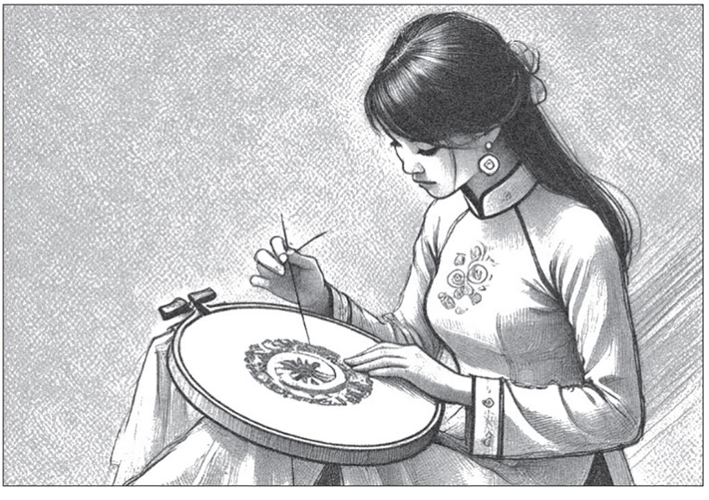Xe vừa vào đến trung tâm thành phố thì Vũ Lê đã trông thấy tấm biển “Cửa hàng tranh thêu Vân La “trước một phòng tranh khá lớn. Anh mừng ra mặt, liền vỗ vai anh bạn họa sỹ cùng đi reo lên: - Hôm nay về du lịch vùng này...là mình còn muốn tìm đến làng thêu nổi tiếng kiếm một tay thêu thật giỏi để thuê thêu một bức tranh...địa chỉ cần gặp đây rồi!. Hay quá!... Không biết làng thêu này có người thêu nổi một bức tranh đẹp như vậy không!